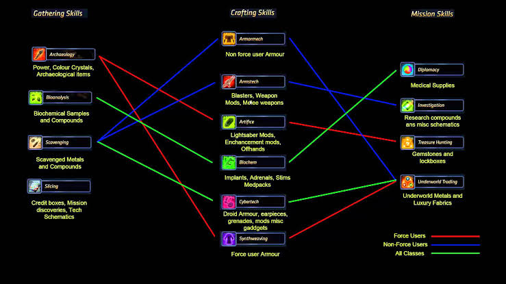 Constroem Jedi e Sith artefatos.Cria modificadores para itens como sabres de luz. É mais recomendado para Sith Warrior e Jedi Knight.